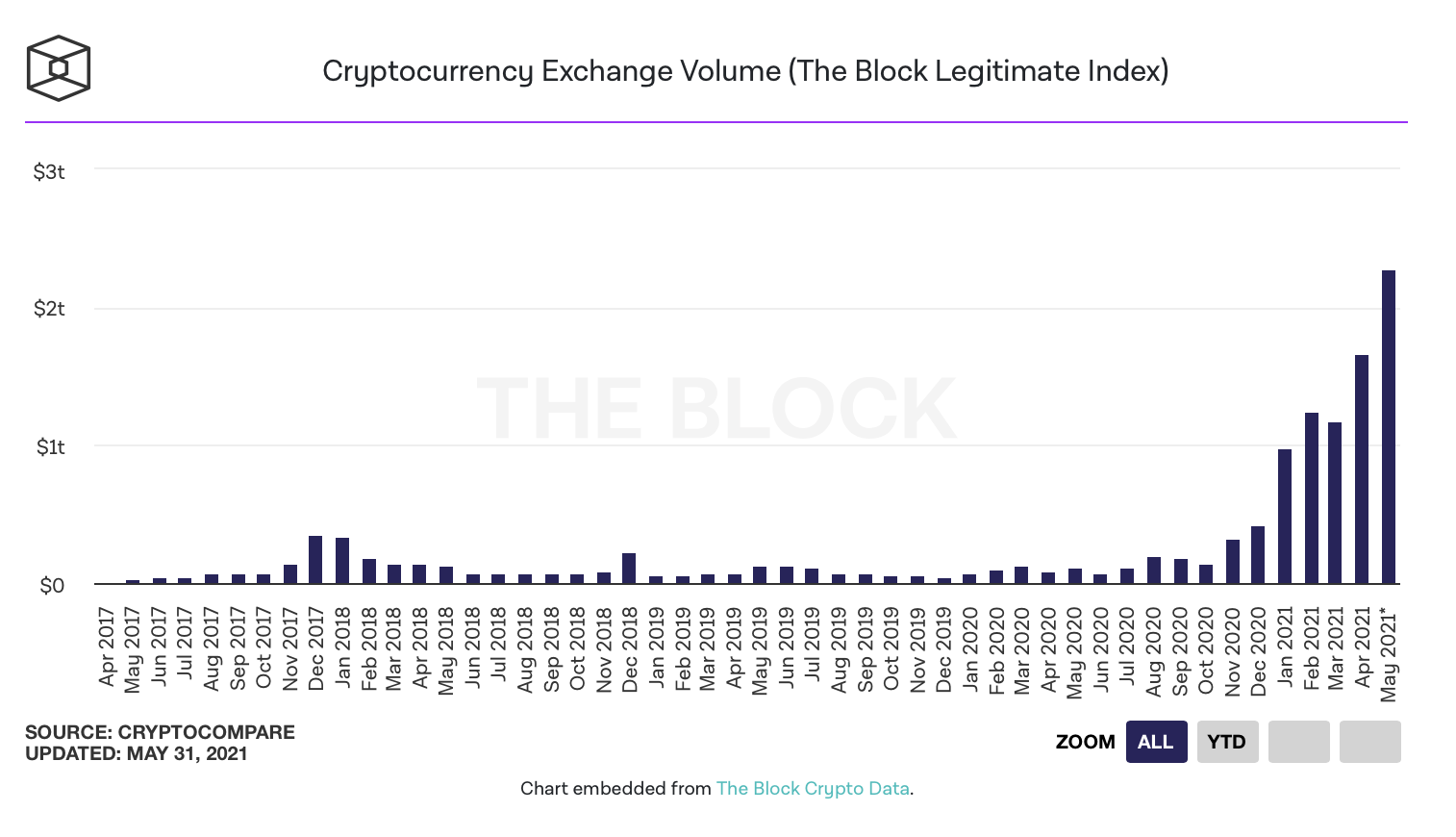 Согласно информации TheBlock, май - это четвертый месяц подряд, во время которого оборот обменников превышает $1 триллион. Индекс собирает информацию у крупнейших обменников, которые довольно точно делятся торговыми данными.