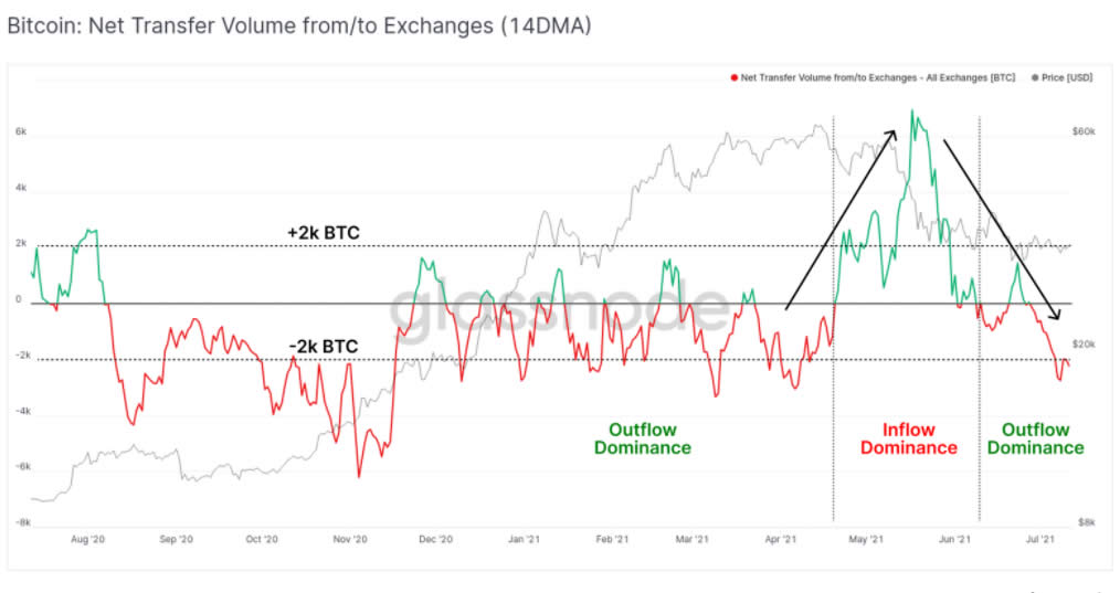 Согласно информации Glassnode, последние две недели количество биткоинов на централизованных обменниках стабильно падает на примерно 2,000 BTC каждый день. (около $66 миллионов в день по текущим ценам).