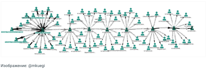 Согласно данным сервиса Whale Alert, вчера неизвестные провели четыре крупных транзакции по 10 000 BTC ($400 млн), с последующей разбивкой на меньшие суммы по разным кошелькам. Схематично это выглядит так: