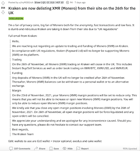 В сети началось обсуждение возможного запрета торговли Monero на Kraken после того, как одним из пользователей было опубликовано якобы письмо биржи к своим клиентам. В нем говорится о том, что торговая площадка с 26 ноября закроет доступ к торгам Monero в Великобритании.
