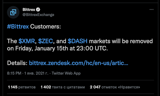 Это уже не первый случай проблем у Monero с различными криптобиржами. Осенью 2020 года электронная торговая площадка ShapeShift удалила из своего торгового списка «конфиденциальные монеты»: Monero, Dash и Zcash. Тогда биржа также объяснила свои действия нежеланием получить проблемы с законом. Аналогичные действия были предприняты в январе 2021 года и криптобиржей Bittrex, которая тоже захотела избежать конфликта с властями. Известнейшая криптобиржа Coinbase в 2020 году вообще отказалась включать Monero в свой торговый список - как раз из-за позиции регулирующих органов.