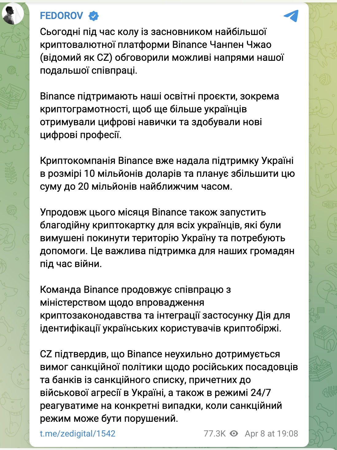 В этом месяце Binance запустит благотворительную крипто карту для всех украинцев, которые покинули страну и нуждаются в помощи. Об этом рассказал глава Минцифры Михаил Федоров после разговора с Чанпеном Чжао.
