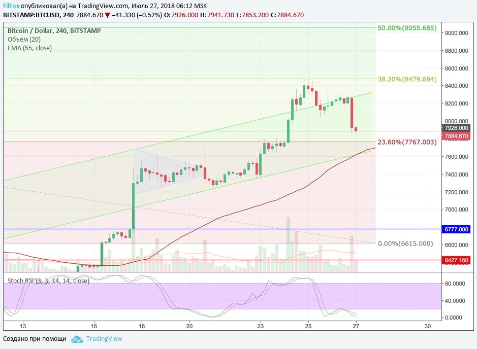 Тогда, цена Bitcoin после снижения на негативных новостях от SEC, в область поддержки 23.6% фибо (7767.00 USD) установила минимум в точке 7798.00 USD.