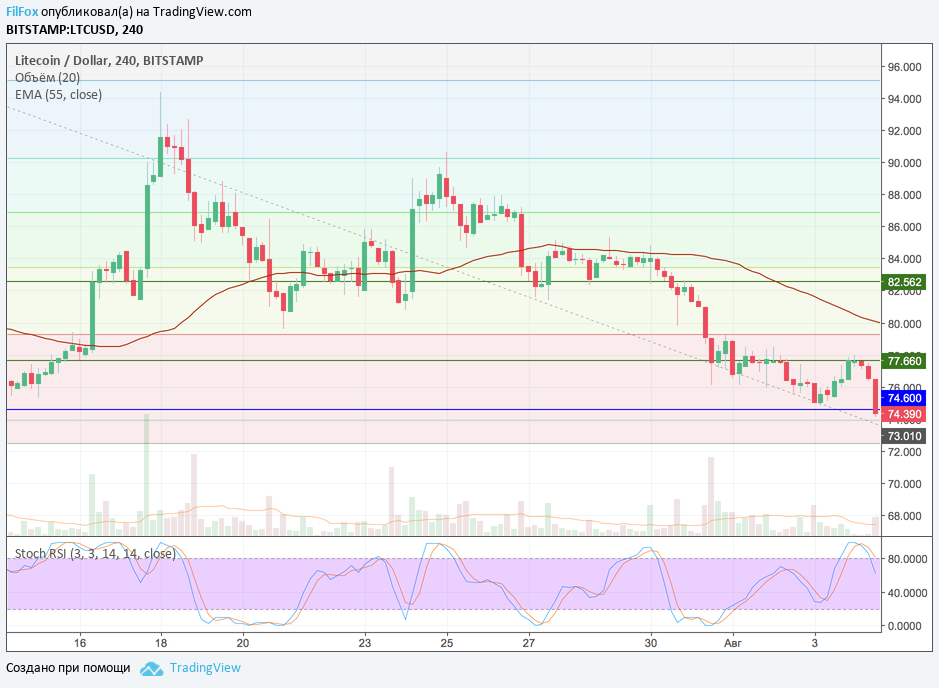 В последнем прогнозе по Litecoin от 03.08.2018 было написано, что если цена лайта пробьёт разворотный уровень 74.60 USD, то обязательно протестирует нулевой уровень фибоначчи 72.50 USD. Используя это утверждение, вчера мы увидели, что пара LTC/USDT прошила уровень 74.60 USDT, даже не зацепившись за эту поддержку.