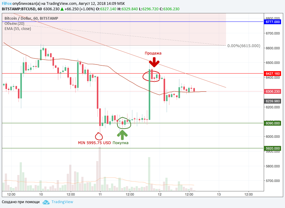 Анализируя публикации ForkNews за 11.08.2018, делаем вывод, что пара ещё не достигла разворотного уровня и будет продолжать снижаться. Однако вчера, развернувшись в точке минимума 5995.75 USD, пара восстановилась в область поддержки 6427.16 USD.