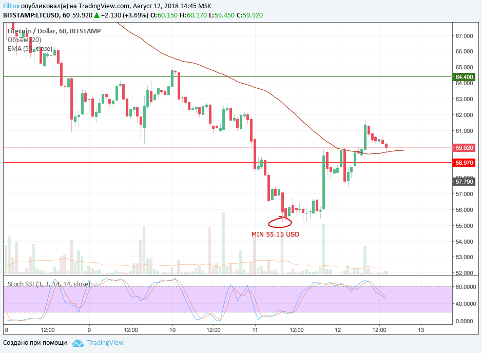Аналогичная ситуация сейчас происходит и с Litecoin. Можно было предусмотреть отскок цены от минимума 55.15 USD, но заработать на таком отскоке сложно даже профессиональному трейдеру. Нужно постоянно держать руку на кнопке «Продать».