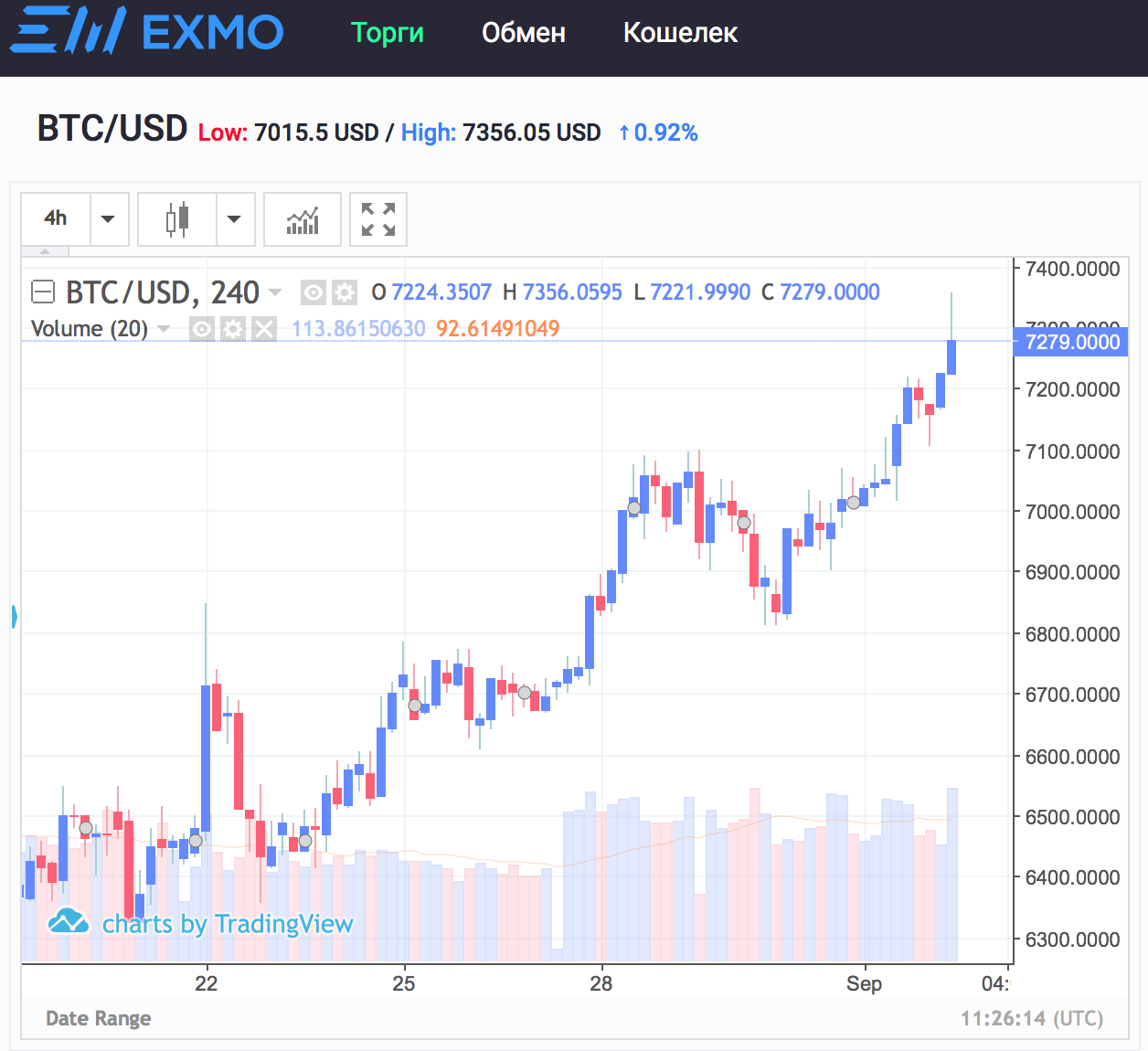В поисках новых точек входа на рынок мы проанализировали прогноз от 31.08.2018, в котором говорилось, что откат цены в область поддержки, вызвал довольно крупные объёмы покупок с расчетом продвижения курса к отметке 7300.00 USD. Однако, когда мы после прочтения прогноза зашли на биржу EXMO, то момент для покупки был упущен. Цена находилась в области семи тысяч долларов. Однако колебания цены на этом уровне давал нам шанс приобрести актив в коридоре консолидации.